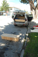 Now my Grampa will help me demonstrate the bedroom arrangement.  To make the bedroom, you have to fold down the back seats and then move the two top boxes forward to cover the back.  Then put the boards over the top of the boxes and put the mattresses on top of the platform.  It was wide enough for three of us in the back while Kaia stretched out on a comfy blow-up mattress up front.
